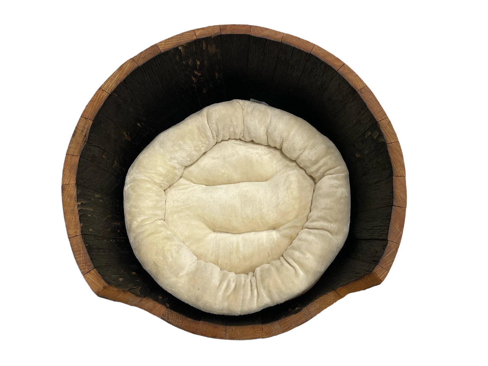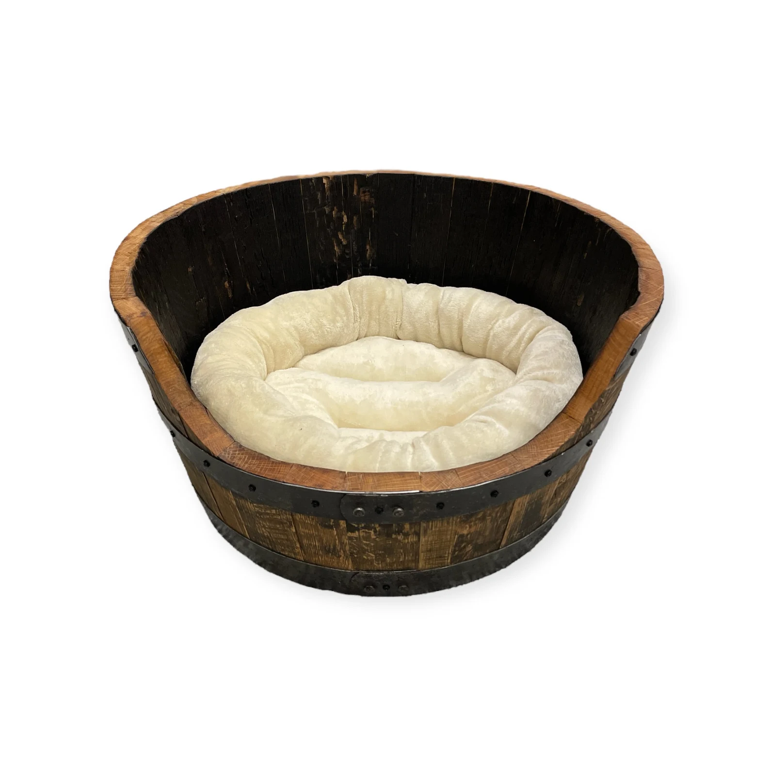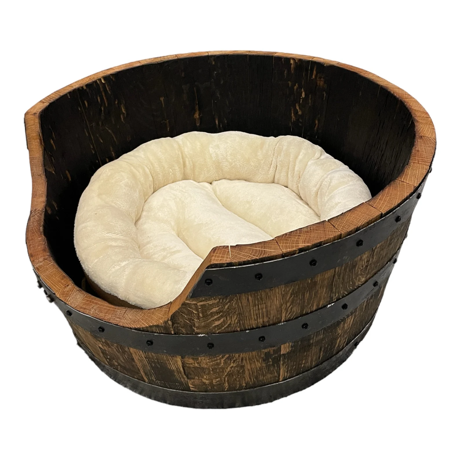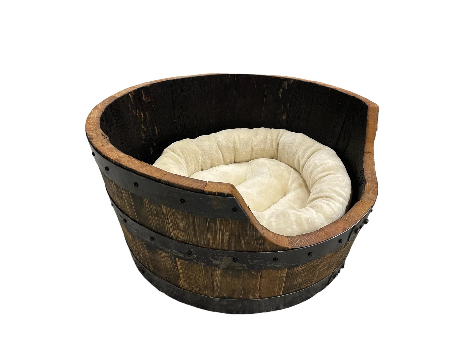 Give your pup a bed as unique as they are! Our Barrel Pet Bed transforms reclaimed bourbon barrels into a cozy retreat that’s one-of-a-kind—no two beds sport the same wood character. Topped with a plush, supportive round cushion in beige with a washable cotton cover, it’s comfort meets sustainability. Safety is built in with smooth, rounded barrel bands, while the sealed interior keeps everything clean and fresh. Perfect for small dogs under 30 lbs, measuring 25x25x14 inches outside and 20x20x12 inches inside. Handcrafted in our Wisconsin workshop with sturdy matte finish screws, each bed is made to order with a three-week lead time. Your furry friend deserves a bed as special as they are!